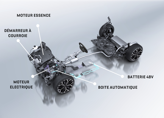 El motor eléctrico síncrono de imanes permanentes está integrado en la nueva transmisión de doble embrague de seis velocidades e-DCS6. Con 21 kW (28 caballos de fuerza) y un par máximo de 55 Nm, puede funcionar solo con energía eléctrica a bajas velocidades y bajo cargas moderadas. Durante la desaceleración, el motor eléctrico actúa como generador para recuperar la energía cinética y alimentar la batería de 0,9 kWh situada bajo el suelo. El sistema también proporciona fácilmente potencia para arrancar el motor de gasolina.