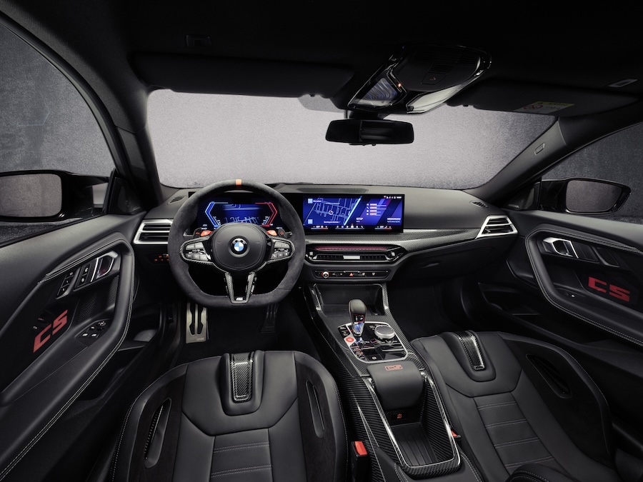 Con un aro de base plana, levas de cambio, un marcador central rojo a las 12 en punto y dos botones M para seleccionar las configuraciones individuales del vehículo, el volante M Alcántara de serie -que está disponible en una versión calefactada como opción y cuenta con un diseño de tres radios- aporta un auténtico toque de competición al habitáculo. Los elementos decorativos del panel de instrumentos y la consola central son de fibra de carbono M. Otros detalles específicos son el logotipo rojo “CS” en la consola central, los cinturones de seguridad M y las placas de los umbrales de las puertas de acceso, que por primera vez son negras con el logotipo “M2 CS” y un contorno rojo. Ahora iluminados con el logotipo “CS”, los paneles embellecedores de las puertas acaparan toda la atención. El color utilizado puede ajustarse individualmente, al igual que la iluminación ambiental de serie. Cuando está apagada, se aprecia una estructura de carbono. El revestimiento de techo M Antracita completa el interior deportivo.