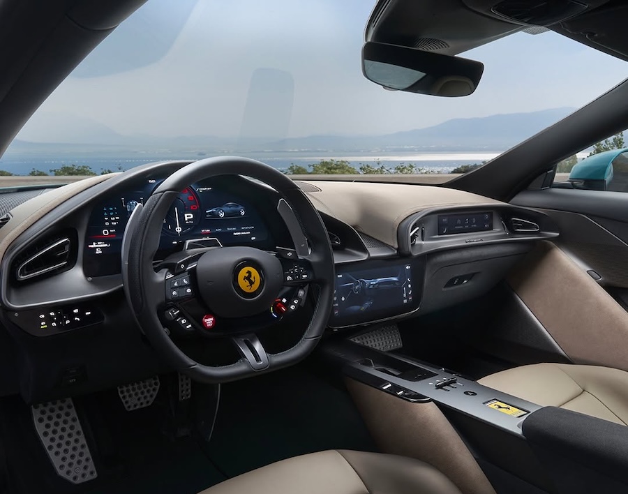 La disposición de la cabina ha cambiado sensiblemente, hay pantallas más grandes pero se ha vuelto a interruptores y botones de tipo más convencional en sustitución de los controladores táctiles del Roma. El infoentretenimiento es compatible con Android y Apple inalámbricos. Hay tres pantallas en el interior del Amalfi, la del conductor, de 15,6″; la central de 10,2 y la del copiloto de 8,8.
