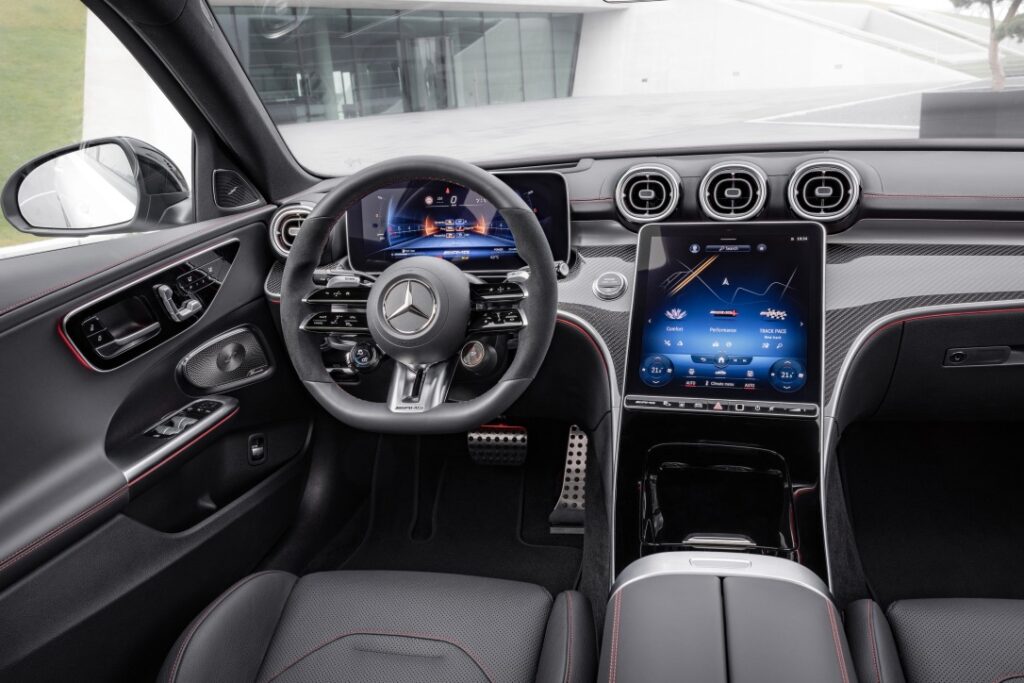En el habitáculo encontramos numerosos elementos que acentúan el ambiente deportivo, como los asientos AMG con diseño específico del acolchado y tapizados en símil de cuero ARTICO/microfibra MICROCUT de color negro con costuras de adorno en color de contraste rojo y cinturones de seguridad rojos. Como equipo opcional pueden elegirse tapizados de cuero y napa para los asientos. A esto se añade el volante AMG Performance en napa con sección inferior plana, perforado en la zona de agarre y con levas de cambio de aluminio plateado. Las dos teclas redondas AMG en el volante hacen posible un manejo rápido y seguro de diversas funciones de dinamismo y de los programas de conducción AMG DYNAMIC SELECT. El tablero de instrumentos y las líneas de cintura están revestidos de símil de cuero ARTICO con costuras de adorno rojas. El ambiente deportivo y lujoso se completa con pedales deportivos AMG, alfombrillas AMG y listones de umbral luminosos con distintivo AMG.