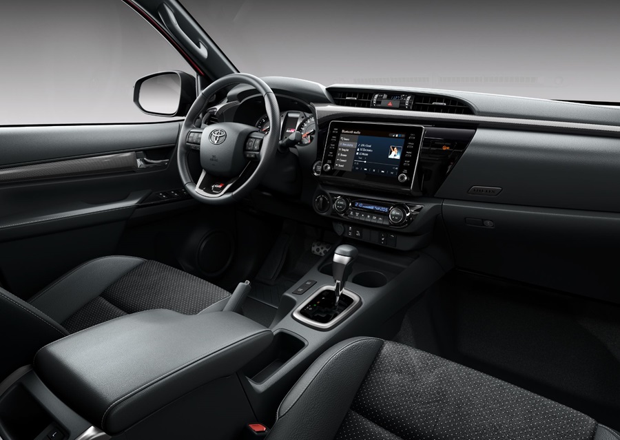 Siguiendo con el negro, se incluye un alerón en este color tras la pared de la cabina para que la aerodinámica del vehículo no se vea perjudicada y, además, se incorpora una cubierta de la caja de carga rígida —también negra— para reforzar la imagen de uniformidad. Por último, en referencia al exterior, se cambia el diseño de la rejilla de la parrilla frontal de color negro que incorpora el nombre de la marca y el logotipo GR. Ahora el color plateado gana presencia en el protector de la parte inferior del paragolpes y se rediseña la estética del alojamiento de los faros antiniebla.