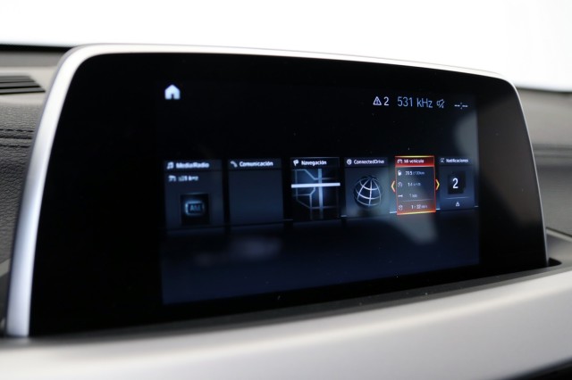 Retrovisor interior. con ajuste automático anti-deslumbramiento, Navegación, Faros LED con contenido ampliado, Control de distancia en aparcamiento (PDC) delantero y trasero, Cinco plazas ( 2+3 ), Seis altavoces con subwoofer, Equipo de audio con radio AM/FM y RDS pantalla color, Control remoto de audio en el volante, Toma/s de 12v en la zona de carga. los asientos delanteros y los asientos traseros, Cuatro frenos de disco siendo cuatro ventilados, Apertura a distancia del maletero con control remoto, Luz en el maletero, Espejo de cortesía en conductor en acompañante, Diferencial deslizamiento limitado delantero de tipo electrónico, Control electrónico de tracción, Combustible: diesel y Combustible primario: diesel, Ordenador de viaje con velocidad media. consumo medio. consumo instantáneo y autonomía, Acabados de lujo: pomo de la palanca de cambios en negro piano. consola central en negro piano. puertas en aluminio simil y tablero en negro piano, Alfombrillas, Faros con lente de superficie compleja. bombilla halógena y luz larga con bombilla halógena, Regulación de los faros con ajuste de altura manual y sensor de luz ambiental, Encendido diurno automático, Airbag lateral de cortina delantero y trasero, Bandeja trasera rígida, Sujeción de carga, Cierre centralizado con mando a distancia y contról de los elevalunas, Airbag frontal del conductor inteligente. airbag frontal del acompañante desconectable y inteligente, Dos reposacabezas en asientos delanteros ajustables en altura. tres reposacabezas en asientos traseros ajustables en altura, Cinturón de seguridad delantero en asiento conductor y acompañante con pretensores, Cinturón de seguridad trasero en lado conductor. cinturón de seguridad trasero en lado acompañante. cinturón de seguridad trasero en asiento central de 3 puntos, Asientos de tela (material principal) y de tela (material secundario), Apoyabrazos central delantero, Apoyabrazos trasero, Asiento delantero del conductor y acompañante individual. ajuste longitudinal manual y ajuste manual en altura con ajuste manual del respaldo, Asientos traseros de tres plazas de tipo banco de orientación delantera con banqueta fija y respaldo abatible 40/20/40, Volante multi-función de aleación y cuero ajustable en altura y en profundidad, Dirección asistida eléctrica con endurecimiento progresivo s/velocidad, Sujetavasos en los asientos delanteros y los asientos traseros, Sistema de ventilación con pantalla digital. filtro de pólen y filtro de carbón activo, Controles de climatización diferenciados digitales para conductor/acompañante, Aire acondicionado bizona de automático, Cristales tintados, Limpiaparabrisas delantero con sensor de lluvia, Elevalunas eléctricos delanteros y traseros con dos de ellos de un solo toque, Lavaparabrisas calentable, Consola en el suelo, Distribución electrónica de la frenada, Sistema de servofreno de emergencia, Indicador de baja presion de los neumáticos con visualización de presión y sensor Montado en la llanta, Preparación Isofix, Tarjeta / llave inteligente automática con arranque sin llave, Telemática ( 999 meses incluidos) vía SIM en el vehículo con aviso avanzado automático de colisión y sistema de seguimiento, Freno mano electrónico, Control de frenada en curva, Filtro de partículas, Resultado de pruebas de impacto Euro NCAP :. puntuación global: 5.00. protección adultos: 90.00. protección niños: 87.00. protección peatones: 74.00. puntuación ayudas a la seguridad: 77.00. Versión evaluada: BMW X1 sDrive18d 5dr SUV y Fecha del test: 02 dic 2015, Control de arranque en pendiente, Sistema de alarma de colisión: activa las luces de freno con asistencia de frenado. monitorización del conductor y frenado a baja velocidad de 3 Km/h como mínimo aviso visual/ acústico, Bluetooth ( incluye conexión para el teléfono ) ( incluye música por ‘streaming’ ), Start/Stop parada y arranque automático, Conexión para: USB delantero, Botón de arranque del vehículo, Pantalla multifunción de 6.5 “, Luces de freno. luces intermitentes laterales. Luces de día y Luces traseras con tecnología LED, Recuperación de la energía, Reconocimiento señales de tráfico, Modos de conducción con cartografía del motor y dirección
