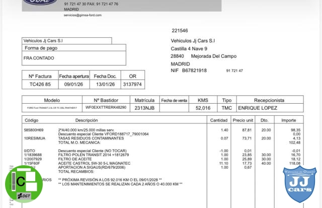 PRECIO MÁS IVA 25537€ + 21%=30900€, DISTINTIVO DGT VERDE-C-, GARANTÍA OFICIAL FORD HASTA 26/08/2026, FINANCIAMOS 100% A SU MEDIDA SIN COMPROMISO, CAMBIO DE NOMBRE INCLUIDO, KM GARANTIZADOS, EL COCHE SE ENTREGA CON LA REV PASADA EN TALLER OFICIAL FORD, ACEITE, FILTROS, FRENOS, ITV AL DÍA, NAVEGADOR, CARPLAY, CLIMATIZADOR, RADIO CD, USB, CONTROL DE CRUCERO Y LIMITADOR DE VELOCIDAD, AVISO CAMBIO DE CARRIL, ORDENADOR DE A BORDO, CAMARA DE MARCHA ATRAS, SENSORES DE APARCAMIENTO DELANTEROS Y TRASEROS, SENSORES DE LLUVIA Y LUZ, ELEVALUNAS ELÉCTRICOS, ESPEJOS ELÉCTRICOS, CIERRE CON MANDO, AIRBAG, ABS, ESP, MUY BONITO. ESTAMOS EN MEJORADA DEL CAMPO, A 15 MINUTOS DEL CENTRO DE MADRID. MÁS VEHÍCULOS Y FOTOS EN VOJJCARS. MÁS DE 20 AÑOS Y 2500M2 DE INSTALACIONES CON TALLER PROPIO NOS AVALAN. GARANTIZAMOS POR ESCRITO LOS KM. LA GRAN MAYORÍA DE NUESTROS VEHÍCULOS DISPONEN HISTORIAL DE MANTENIMIENTO. CON NOSOTROS LOS TRÁMITES DE PONER EL VEHÍCULO A TU NOMBRE LE SALEN GRATIS.TENEMOS MÁS EN NUESTRO STOCK, VW CRAFTER, RENAULT MASTER, CITROEN JUMPER, RENAULT TRAFIC, FORD TRANSIT L4H3, MERCEDES SPRINTER, IVECO, FIAT DUCATO, BOXER, PARTNER, TRAFIC, VITO, ISOTERMO, FRIGORÍFICO, TRAMPILLA, GRÚA, NISSAN CESTA, HONDA, FIAT SCUDO, CONNECT, CRAFTER COMBI, MOVANO COMBI, IVECO RUDAS GEMELAS.